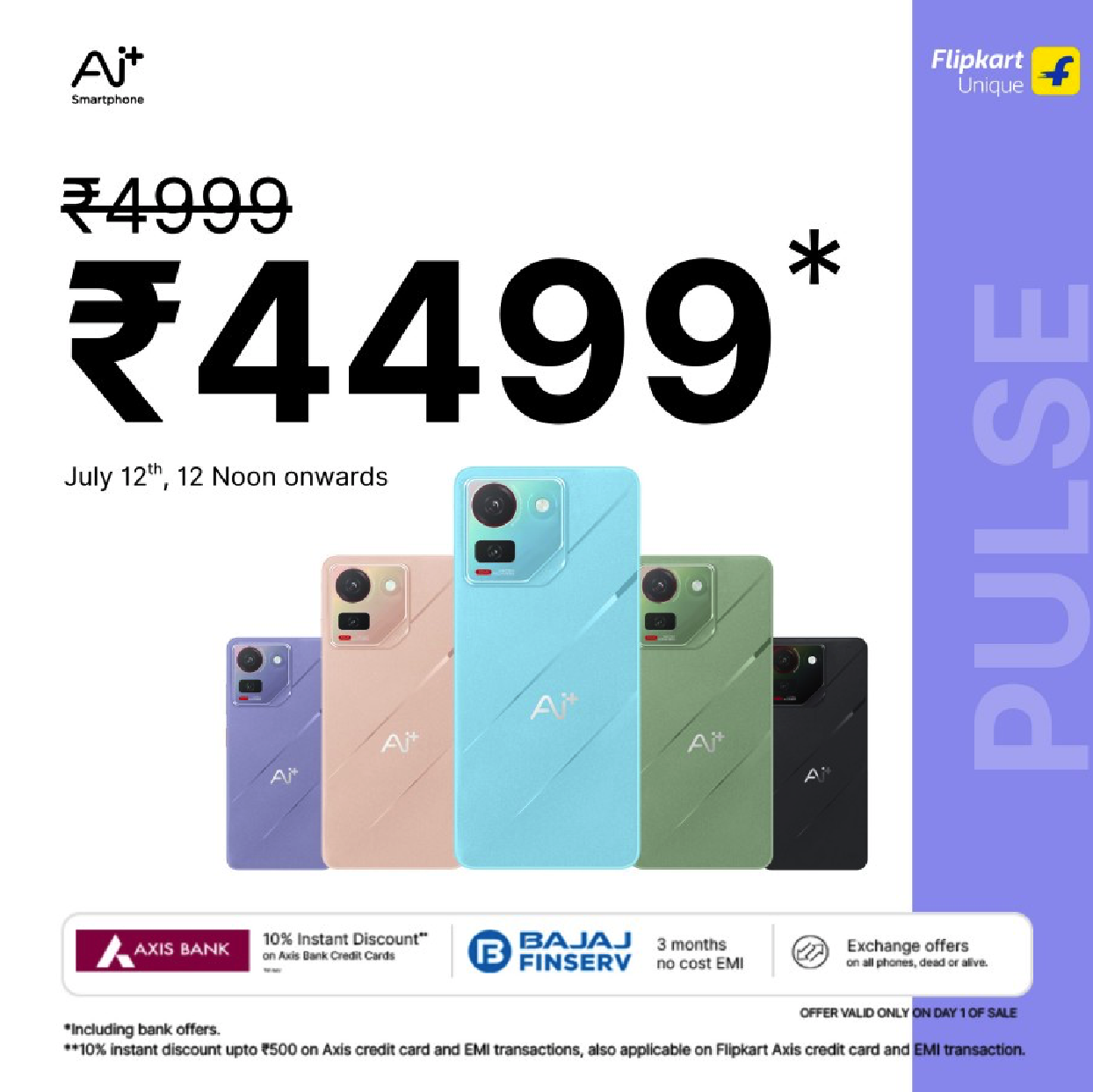 Ai+ Smartphone เปิดตัวเริ่มต้นมาสองรุ่นได้แก่ รุ่น “Pulse” 4G มีจอแสดงผล HD+ ขนาด 6.7 นิ้ว พร้อมอัตราการรีเฟรชเรท 90 Hz โปรเซสเซอร์ประมวลผล Unisoc T615 พร้อมหน่วยความจําที่ขยายได้ถึง 1 TB (micro SD card) โดย Pulse มีกล้อง 50 MP และแบตเตอรี่ 5,000 mAh มีให้เลือกในสีฟ้า ดํา เขียว ม่วง และชมพู เริ่มต้นที่ ₹4,499 (1,700 บาท) เริ่มขายวันที่ 12 กรกฎาคม ราคาถูกมากๆ