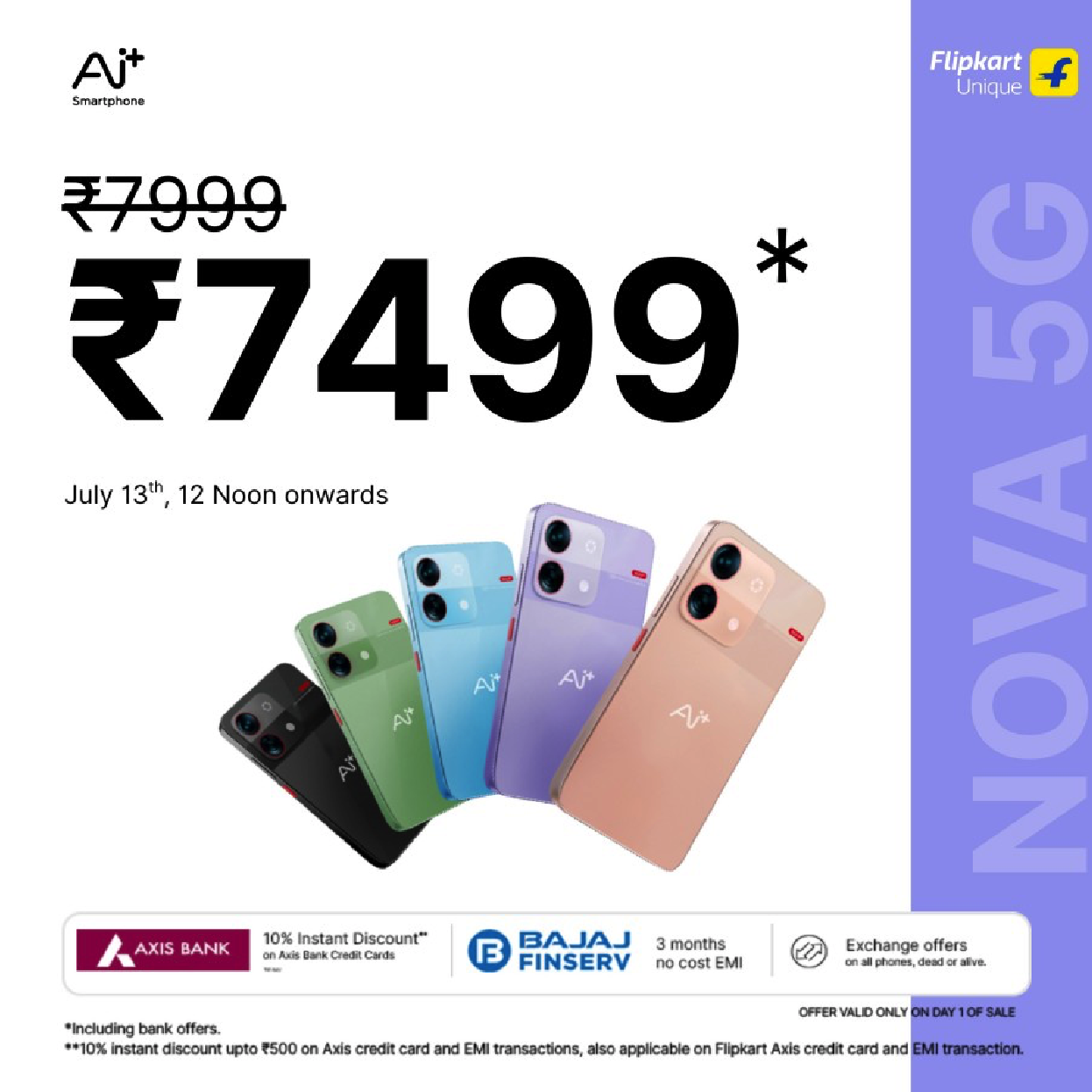 สมาร์ทโฟน Ai+ อีกรุ่นคือ “Nova 5G” มาพร้อมกับจอแสดงผล HD+ ขนาด 6.7 นิ้ว พร้อมอัตราการรีเฟรชเรท 120 Hz ใช้ชิป Unisoc T8200 ที่รองรับระบบ 5G ได้ มาพร้อมหน่วยความจํา Eexpandable สูงสุด 1 TB (Micro SD การ์ด) โดย Nova 5G มาพร้อมกับกล้อง 50 MP และแบตเตอรี่ 5,000 mAh มีสีฟ้า สีดํา สีเขียว สีม่วง และสีชมพู เริ่มต้นที่ ₹7499 (2,853 บาท) นี่ก็น่าจะเป็นสมาร์ทโฟน 5G ที่ราคาเริ่มต้นถูกมากๆจริงๆ วางจําหน่ายตั้งแต่วันที่ 13 กรกฎาคม