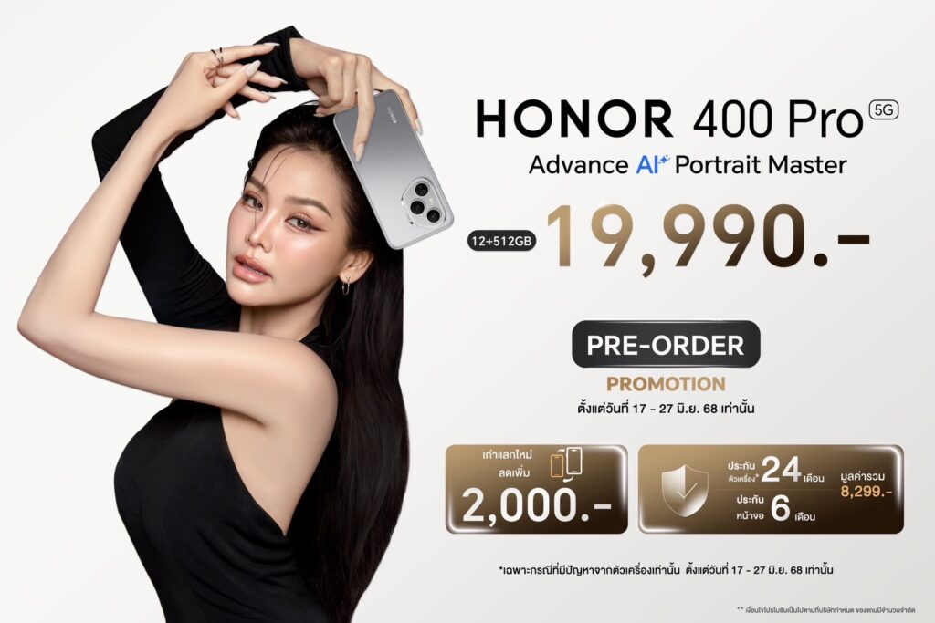 สัมผัสประสบการณ์การถ่ายภาพเหนือระดับด้วยนวัตกรรม Advance AI บนสมาร์ตโฟนเรือธง HONOR 400 Series เริ่มวางจำหน่ายอย่างเป็นทางการตั้งแต่วันที่ 28 มิถุนายน 2568 เป็นต้นไป โดยรุ่น HONOR 400 Pro มีให้เลือก 3 สี ได้แก่ สีเทา (Lunar Grey) สีดำ (Midnight Black) และ สีฟ้า (Tidal Blue) ลุ้นเข้าไทยเร็ว ๆ นี้ ในราคาคุ้มค่าเพียง 19,990บาท สำหรับช่วง Pre-order ระหว่างวันที่ 17 – 27 มิถุนายน 2568 เมื่อสั่งจอง HONOR 400 Pro (รุ่น 12GB+512GB) รับสิทธิพิเศษ อาทิ รับส่วนลดเพิ่ม 2,000 บาท เมื่อเทิร์นเครื่องเก่า, ประกันตัวเครื่องนาน 24 เดือน และประกันหน้าจอแตกนาน 6 เดือน สั่งซื้อได้แล้ววันนี้ทาง Lazada: