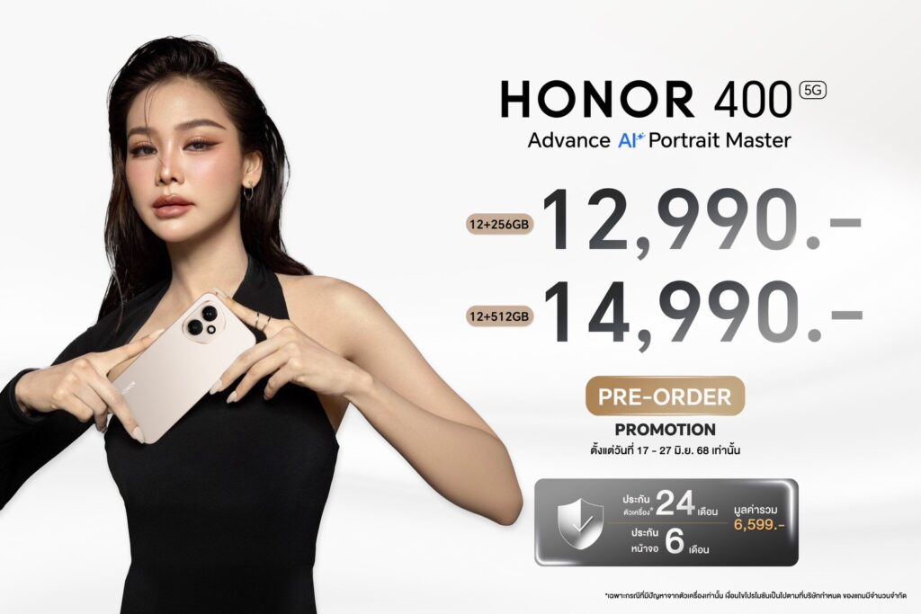 และ HONOR 400 มีให้เลือก 2 สี ได้แก่ สีทอง (Desert Gold) และสีดำ (Midnight Black) พร้อม 2 สเปกให้เลือกตามการใช้งาน ได้แก่ รุ่น 12GB+512GB ราคา 14,990 บาท และ รุ่น 12GB+256GB ราคา 12,990 บาท พิเศษ! Pre-order ระหว่างวันที่ 17 – 27 มิถุนายน 2568 รับสิทธิประโยชน์สุดคุ้ม อาทิ อัปเกรดความจุฟรี 2 เท่า จาก 256GB เป็น 512GB, ประกันตัวเครื่องนาน 24 เดือน และประกันหน้าจอแตกนาน 6 เดือน สั่งซื้อได้แล้ววันนี้ ผ่านแพลตฟอร์มออนไลน์ชั้นนำ Shopee: , TikTok และ Lazada