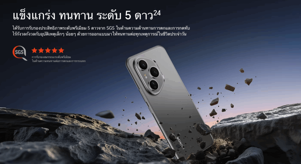 HONOR 400 Pro ไม่ได้โดดเด่นแค่ในด้านกล้องและแบตเตอรี่เท่านั้น แต่ยังได้รับการรับรอง SGS ด้วยมาตรฐาน 5 ดาว ด้านความทนทานต่อการตกกระแทก พร้อมผ่านการทดสอบมาตรฐานการป้องกันฝุ่นและน้ำในระดับ IP68 และ IP69 เพื่อให้ผู้ใช้มั่นใจในความแข็งแกร่งและความทนทานในทุกสภาพแวดล้อม ภายในขับเคลื่อนด้วยชิปประมวลผล Snapdragon 8 Gen 3 ควบคู่กับ GPU Qualcomm Adreno 750 ที่มอบพลังด้านกราฟิกแบบจัดเต็ม รองรับการเล่นเกมกราฟิกสูงได้อย่างลื่นไหล พร้อมผสานกับ RAM ขนาด 12GB และพื้นที่จัดเก็บข้อมูลสูงสุด 512GB รองรับการเก็บภาพถ่ายได้มากถึง 121,000 รูป ตอบโจทย์ทั้งสายครีเอเตอร์และผู้ใช้งานทั่วไปอย่างรอบด้าน
