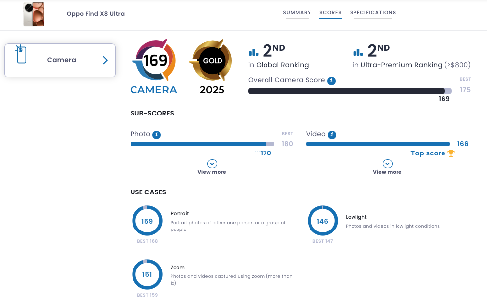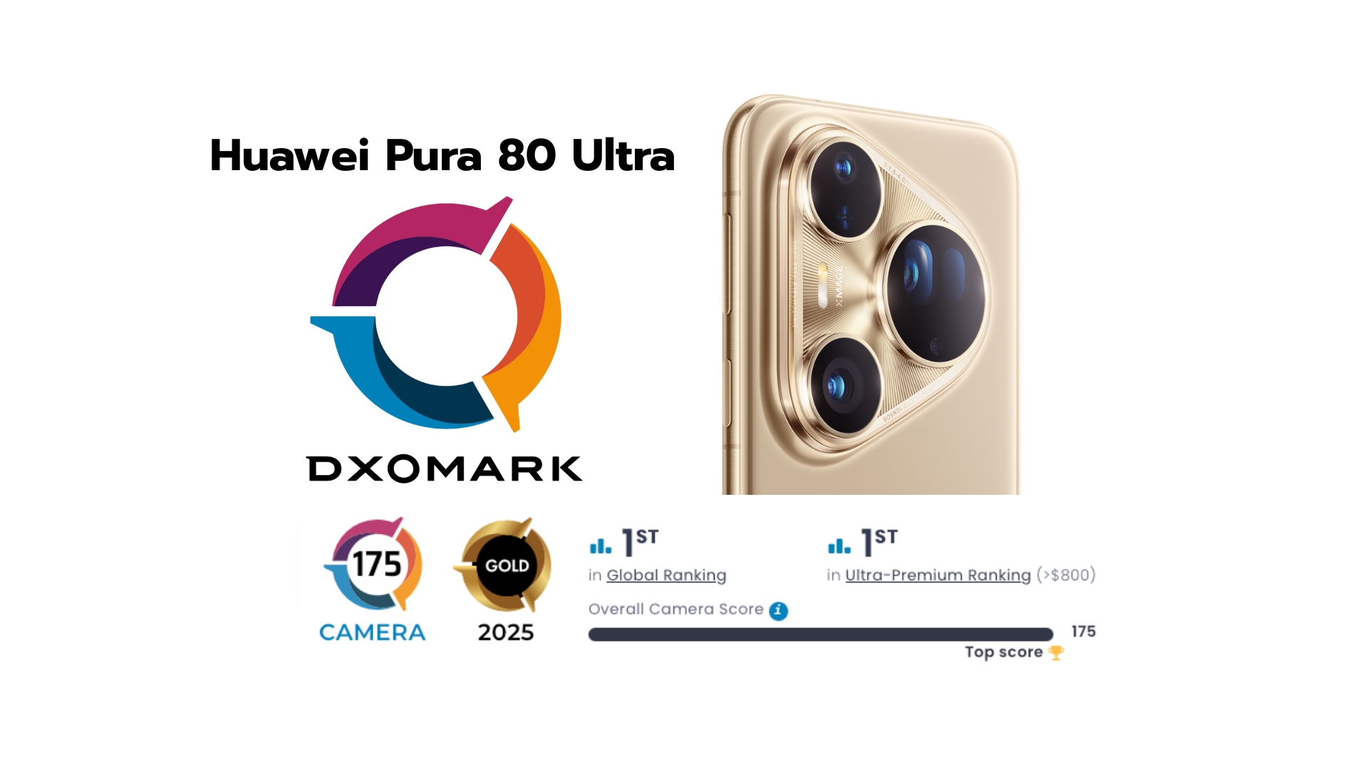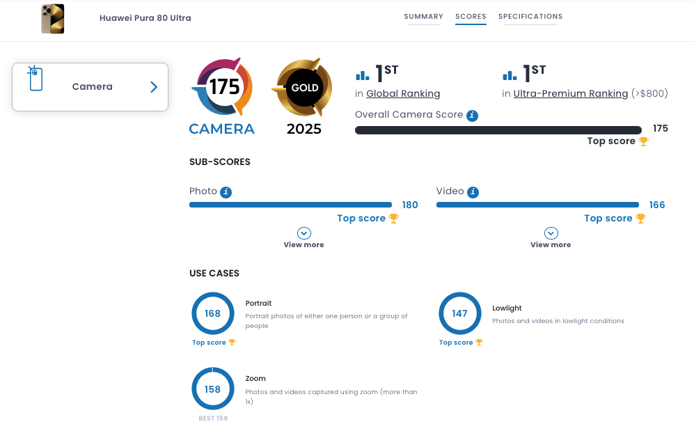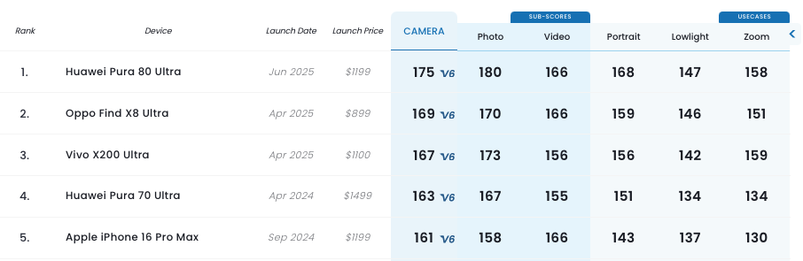 โดย Huawei Pura 80 Ultra เข้ามาใหม่ได้อันดับ 1 ไปด้วยคะแนนรวมไปถึง 175 คะแนน แซง Oppo Find X8 Ultra แชมป์เก่าที่ได้อยู่ 169 คะแนน ขณะที่ vivo X200 Ultra ก็เพิ่งเข้าชาร์ทมาใหม่เช่นกันโดยเข้ามาที่ 3 ได้อยู่ที่ 167 คะแนน ตามมาติดๆ ถ้าเราดูจากการแบ่งคะแนนของอันดับ 1-3 จะเห็นว่า คะแนนของ Huawei Pura 80 Ultra นั้นชนะในทุกๆประเภทเลย ไล่มาจาก Photo ที่ 180 คะแนน, Video 166 คะแนน ซึ่งเท่ากับ Apple iPhone 16 Pro Max และ Oppo Find X8 Ultra อันนี้น่าสนใจมาก เพราะใครๆก็รู้ว่า iPhone นั้นเป็นเจ้าทุกสถาบันในเรื่อง Video แต่ตอนนี้สมาร์ทโฟนฝั่งจีนมาตีตื้นได้แล้ว ต้องรอชมกันต่อว่าเมื่อ iPhone 17 Pro Max เปิดตัวจะทำได้ดีกว่าเดิมไหม ส่วนในด้านอื่นๆ เช่น Portrait (ภาพบุคคล), Lowlight (แสงน้อย) นั้นทาง Huawei Pura 80 Ultra ก็ชนะทุกรุ่นหมด ยกเว้นในเรื่อง Zoom (ซูม) ที่ตกเป็นของ vivo X200 Ultra ที่ชนะไปอย่างฉิวเฉียด