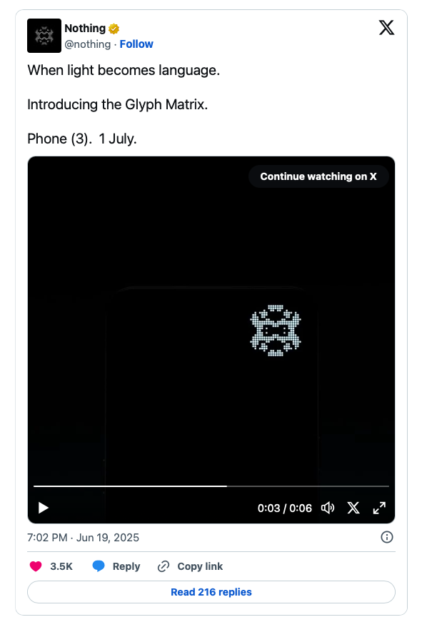 ไม่นานมานี้ Nothing ได้ประกาศว่าสมาร์ทโฟนเรือธงตัวท็อปที่หลายๆคนรอคอย นั่นคือ “Phone (3)” ที่กําลังจะเปิดตัวในวันที่ 1 ก.ค. นี้หลังจากห่างหายจากรุ่นเดิมอย่าง “Phone (2)” มาหลายปีอยู่ ซึ่ง Phone (3) นี้ทาง Nothing ได้เผยกิมมิคออกมาแล้วว่า จะไม่มีไฟ Glyph LEDs ที่ด้านหลังแล้ว ซึ่งเจ้าไฟ Glyph นั้นเป็นเหมือนเครื่องหมายการค้าของแบรนด์ Nothing ตั้งแต่กำเนิดสมาร์ทโฟนรุ่นแรกของบริษัทเลย และล่าสุด Nothing ก็ได้เผยไต๋อีกว่า เจ้าไฟ Glyph ที่หายไปจะถูกแทนที่ด้วย “Glyph Matrix” ซึ่งจะเป็นจอแบบ mini LED ที่เป็นจอแสดงผลแบบดอทเมทริกซ์ทรงสี่เหลี่ยมจตุรัส ติดตั้งอยู่บนมุมขวาบนของด้านหลังเครื่อง คาดว่าจะเอาไว้ใช้แสดงสถานะต่างๆ อย่างสายโทรเข้า ข้อความเข้าและอื่นๆ มากมาย โดย Glyph Matrix จะแสดงเป็นสัญลักษณ์ไอคอนที่มีลูกเล่นต่างๆกันไป และจะกลายเป็นกิมมิคใหม่ของ Nothing Phone (3) นี้
