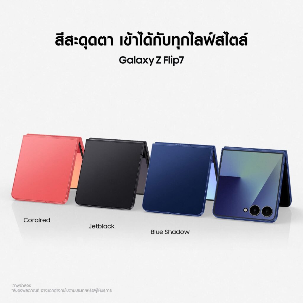 Z Flip7 จะวางจําหน่ายใน Jet Black, Blue Shadow และ Coral Red และยังมีสีพิเศษ สี Mint ซึ่งจะวางจำหน่ายเฉพาะทาง Samsung.com เท่านั้น