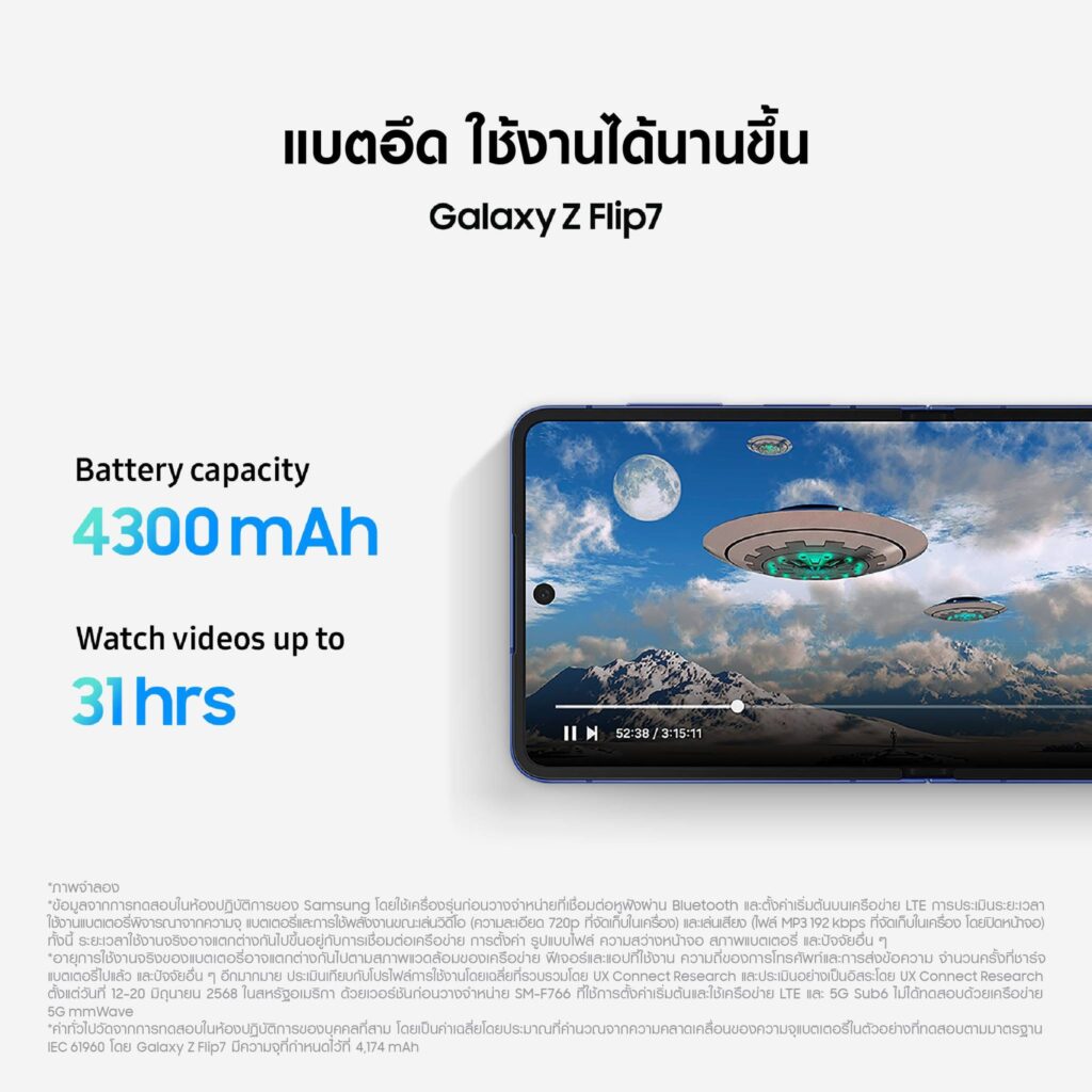 Z Flip7 จะมีแบตเตอรี่ที่ใหญ่ขึ้นเป็น 4,300mAh ชมวิดีโอได้ต่อเนื่อง 31 ชั่วโมง ชาร์จไว 25 Watt, ไร้สาย 15 Watt รองรับการกันน้ำกันฝุ่น IP48